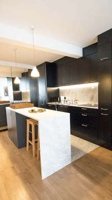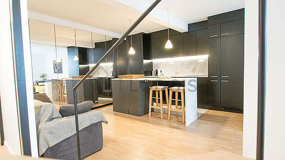 Cet appartement dispose d'une magnifique cuisine avec du parquet au sol et tout l'équipement nécessaire pour votre quotidien : plaques de cuisson, réfrigerateur, congélateur, four, hotte, grille pain, bouilloire électrique, cafetière, table à manger, etagère, placard, vaisselle, tabouret.