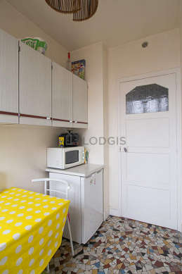Cet appartement dispose d'une cuisine et tout l'équipement essentiel pour votre quotidien : réfrigerateur, micro ondes, table à manger, placard, 2 chaise(s).