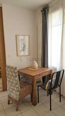 Cet appartement est composé d'un superbe salon avec du carrelage au sol et des fenêtres double vitrage. Ce salon très calme est meublé et équipé pour rendre votre séjour agréable : télé, draps, couettes, réfrigerateur, canapé, table à manger, table basse, penderie, placard, vaisselle, 3 chaise(s), tabouret, table de chevet, etendoir, lampadaire sur pied, lampe, miroir, porte manteaux, poubelle, rideaux, tableau, tapis, vase1 canapé(s) lit(s) de 140cm.
