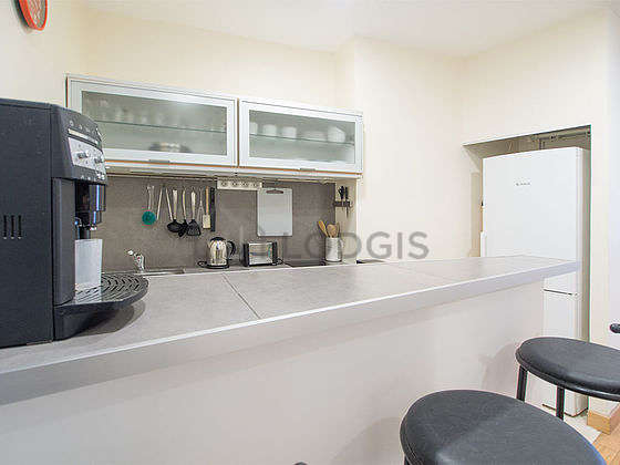 Cet appartement dispose d'une magnifique cuisine avec du carrelage au sol et tout l'équipement nécessaire pour votre quotidien : plaques de cuisson, réfrigerateur, congélateur, micro onde combiné, grille pain, cafetière, placard, tabouret, bar, poubelle.