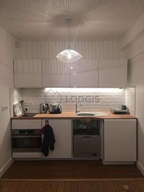 Cet appartement dispose d'une magnifique cuisine avec du parquet au sol et tout l'équipement essentiel pour votre quotidien : plaques de cuisson, réfrigerateur, congélateur, micro onde combiné, cafetière, placard, vaisselle.