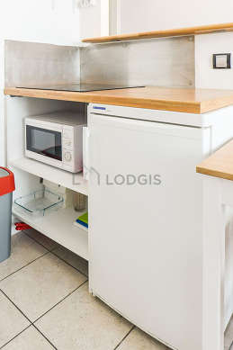 Cet appartement dispose d'une cuisine avec du carrelage au sol et tout l'équipement nécessaire pour votre quotidien : plaques de cuisson, réfrigerateur, micro ondes, grille pain, commode, vaisselle.