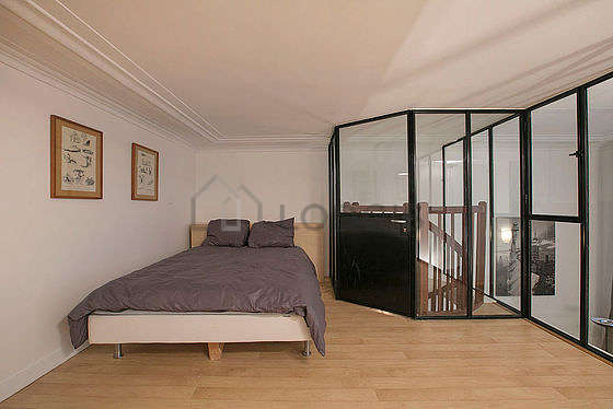 Grâce à une belle hauteur sous plafond, une magnifique mezzanine a pu être installée dans cet appartement , vous offrant ainsi une vraie pièce supplémentaire équipée de draps, couettes, commode, lampadaire sur pied, tableau.