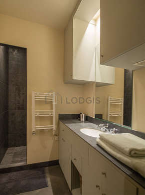 Cet appartement est équipé d'une salle de bain magnifique. Cette salle d'eau bénéficie du nécessaire pour votre bien-être au quotidien : placard, douche séparée, lavabo, radiateur sèche-serviettes. Les toilettes sont intégrées dans la salle de bain.