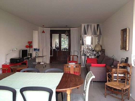 Cet appartement est composé d'un beau salon avec du parquet au sol vue sur jardin. Ce salon très calme est meublé et équipé pour rendre votre séjour agréable : télé, canapé, 1 fauteuil(s), table à manger, penderie, armoire, buffet, vaisselle, 1 chaise(s), lampadaire sur pied, meuble tv, miroir, vase.
