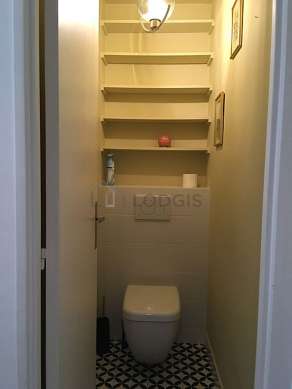 Cet appartement est équipé d'une salle de bain. Cette salle d'eau bénéficie du nécessaire pour votre bien-être au quotidien : serviettes de bain, etagère, baignoire, tabouret, sèche cheveux, etendoir, lavabo, miroir, porte serviettes, poubelle. Les toilettes sont séparées de la salle de bain et situées dans une pièce indépendante.
