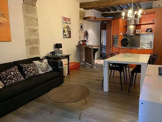 Cet appartement est composé d'un magnifique salon avec du parquet au sol vue sur cour. Ce salon très calme est meublé et équipé pour rendre votre séjour agréable : télé, couettes, canapé, table à manger, table basse, armoire, buffet, poutre, 1 chaise(s)1 lit(s) de 140cm.