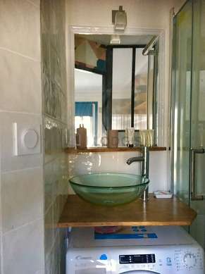 Cet appartement est équipé d'une salle de bain. Cette salle d'eau bénéficie du nécessaire pour votre bien-être au quotidien : serviettes de bain, etagère, douche séparée, sanibroyeur, lavabo, radiateur sèche-serviettes. Les toilettes sont intégrées dans la salle de bain.