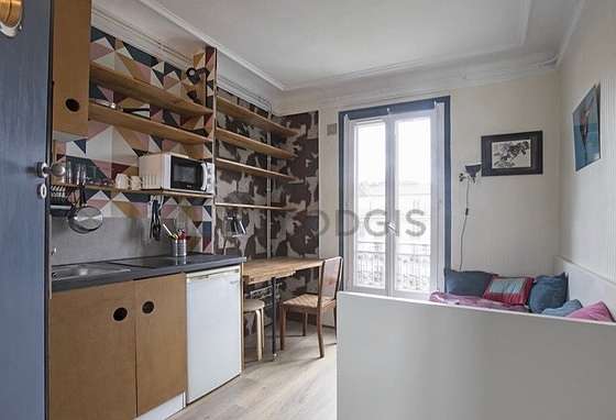 SéjourCet appartement est composé d'un salon avec du parquet au sol et des fenêtres. Ce salon est meublé et équipé pour rendre votre séjour agréable : table à manger, 1 chaise(s), lampe, tableau1 lit(s) de 90cm.