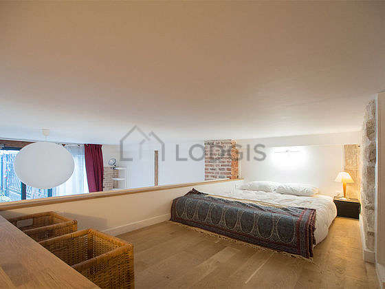 Grâce à une belle hauteur sous plafond, une magnifique mezzanine a pu être installée dans cet appartement , vous offrant ainsi une vraie pièce en plus équipée de draps, couettes, penderie, placard, pierres apparentes, table de chevet.