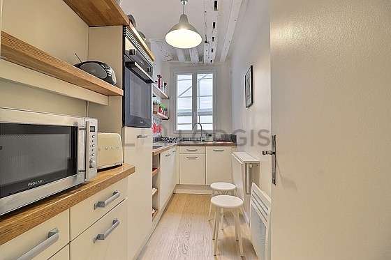 Cet appartement dispose d'une magnifique cuisine avec du parquet au sol et tout l'équipement essentiel pour votre quotidien : plaques de cuisson, réfrigerateur, four, micro ondes, grille pain, bouilloire électrique, cafetière, vaisselle.