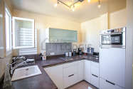 Cet appartement dispose d'une belle cuisine avec du parquet au sol et tout l'équipement indispensable pour votre quotidien : réfrigerateur, four, micro ondes, freezer, grille pain, cafetière, table à manger, vaisselle, 1 chaise(s).