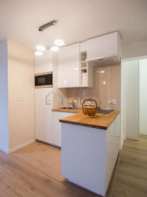 Cet appartement dispose d'une magnifique cuisine avec du carrelage au sol et tout l'équipement nécessaire pour votre quotidien : plaques de cuisson, réfrigerateur, congélateur, micro onde combiné, etagère, placard, vaisselle.