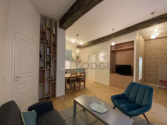 Cet appartement est composé d'un beau salon avec du parquet au sol et des fenêtres double vitrage et vue sur cour. Ce salon très calme est meublé et équipé pour rendre votre séjour agréable : télé, canapé, 1 fauteuil(s), table à manger, table basse, bureau, etagère, poutre, 4 chaise(s), meuble tv.