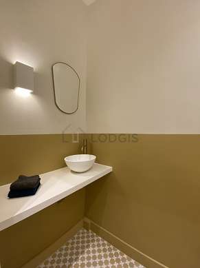 Cet appartement est équipé d'une salle de bain magnifique. Cette salle d'eau bénéficie du nécessaire pour votre bien-être au quotidien : serviettes de bain, etagère, placard, douche séparée, lavabo, radiateur sèche-serviettes. Les toilettes sont séparées de la salle de bain et situées dans une pièce indépendante.