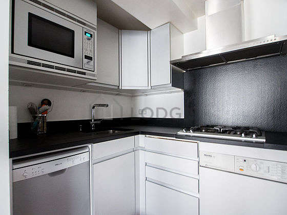 Cet appartement dispose d'une magnifique cuisine avec du parquet au sol et tout l'équipement essentiel pour votre quotidien : plaques de cuisson, réfrigerateur, congélateur, four, micro ondes, micro onde combiné, hotte, grille pain, bouilloire électrique, cafetière, etagère, placard, vaisselle.