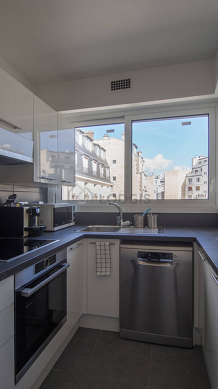 Cet appartement dispose d'une magnifique cuisine avec du carrelage au sol et tout l'équipement essentiel pour votre quotidien : plaques de cuisson, réfrigerateur, congélateur, four, micro onde combiné, hotte, bouilloire électrique, cafetière, placard, vaisselle, tabouret, bar.
