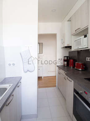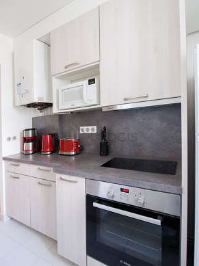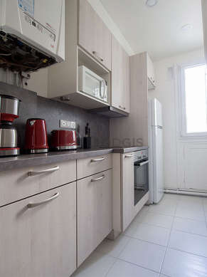 Cet appartement dispose d'une magnifique cuisine avec du carrelage au sol et tout l'équipement essentiel pour votre quotidien : plaques de cuisson, réfrigerateur, congélateur, four, micro ondes, hotte, grille pain, bouilloire électrique, cafetière, etagère, placard, vaisselle.