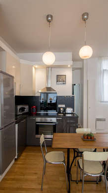 Cet appartement dispose d'une magnifique cuisine avec du parquet au sol et tout l'équipement nécessaire pour votre quotidien : plaques de cuisson, réfrigerateur, congélateur, four, micro ondes, hotte, grille pain, bouilloire électrique, cafetière, placard, vaisselle.