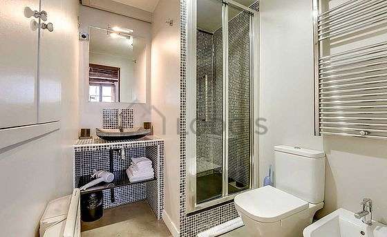 Cet appartement est équipé d'une salle de bain agréable et claire avec des fenêtres. Cette salle d'eau bénéficie du nécessaire pour votre bien-être au quotidien : baignoire, sèche cheveux, sanibroyeur, lavabo, radiateur sèche-serviettes. Les toilettes sont intégrées dans la salle de bain.