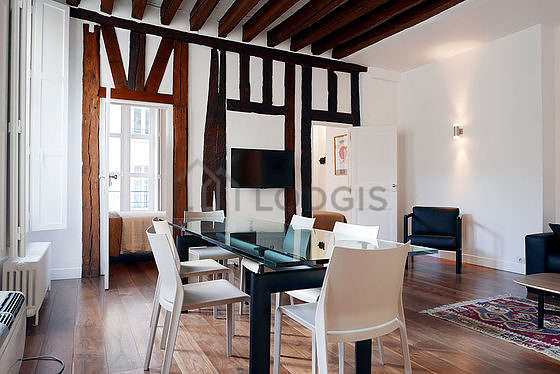 Cet appartement est composé d'un beau salon avec du parquet au sol vue sur cour. Ce salon très calme est meublé et équipé pour rendre votre séjour agréable : télé, canapé, 1 fauteuil(s), table à manger, table basse, poutre, 1 chaise(s)1 canapé(s) lit(s) de 140cm.