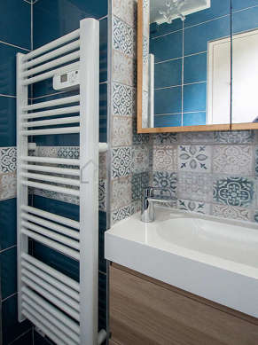 Cet appartement est équipé d'une salle de bain magnifique. Cette salle d'eau bénéficie du nécessaire pour votre bien-être au quotidien : etagère, douche séparée, lavabo. Les toilettes sont séparées de la salle de bain et situées dans une pièce indépendante.