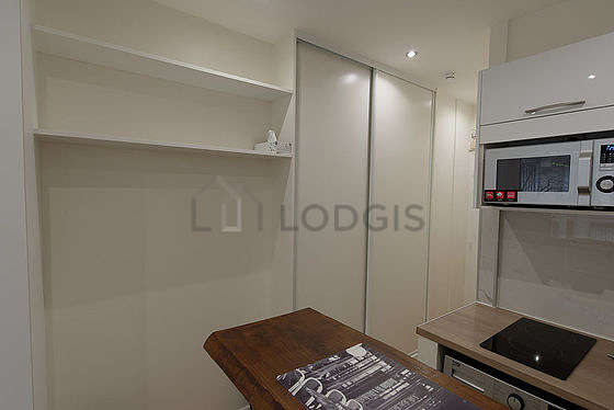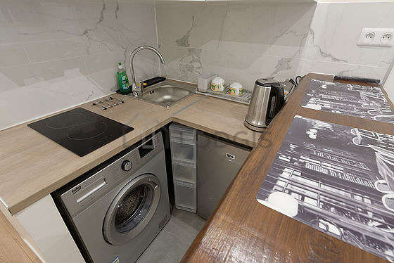 Cet appartement dispose d'une belle cuisine avec du carrelage au sol et tout l'équipement indispensable pour votre quotidien : plaques de cuisson, réfrigerateur, micro ondes, freezer, grille pain, bouilloire électrique, cafetière, placard, vaisselle, bar.