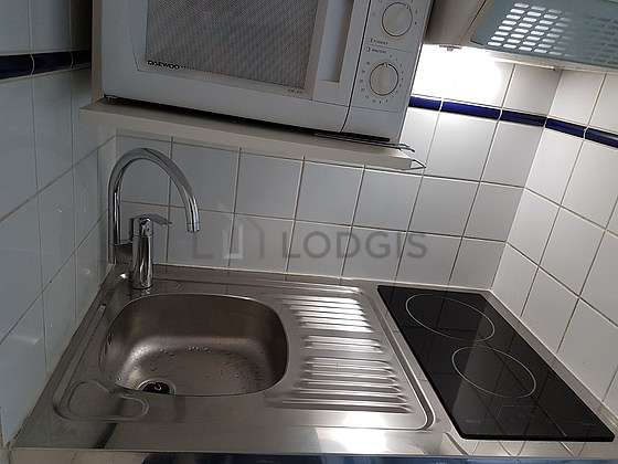 Cet appartement dispose d'une cuisine sur la entrée avec du carrelage au sol et tout l'équipement nécessaire pour votre quotidien : plaques de cuisson, réfrigerateur, micro ondes, freezer, hotte, placard, vaisselle.