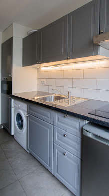 Cet appartement dispose d'une belle cuisine avec du carrelage au sol et tout l'équipement nécessaire pour votre quotidien : plaques de cuisson, réfrigerateur, micro onde combiné, freezer, hotte, table à manger, placard, vaisselle, 1 chaise(s).