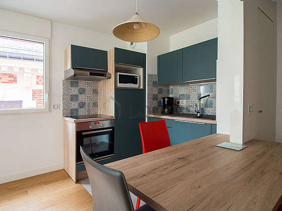 Cet appartement dispose d'une magnifique cuisine avec du carrelage au sol et tout l'équipement essentiel pour votre quotidien : plaques de cuisson, réfrigerateur, four, micro ondes, hotte, etagère, placard, vaisselle.