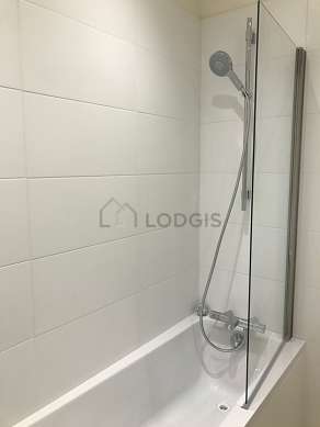 Cet appartement est équipé d'une salle de bain magnifique. Cette salle d'eau bénéficie du nécessaire pour votre bien-être au quotidien : serviettes de bain, armoire, placard, baignoire, etendoir, lavabo, miroir, porte serviettes, poubelle. Les toilettes sont intégrées dans la salle de bain.