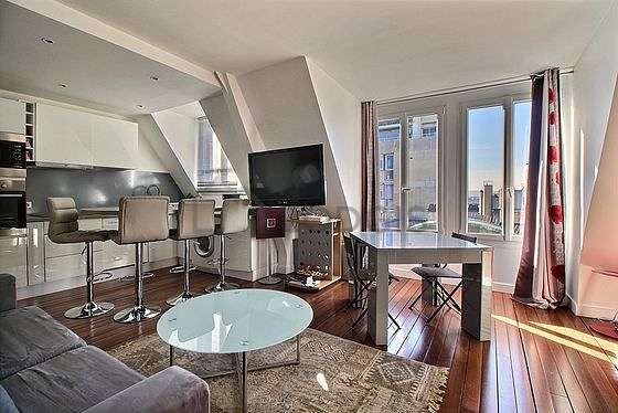 SéjourCet appartement est composé d'un magnifique salon avec du parquet au sol et des fenêtres. Ce salon très calme est meublé et équipé pour rendre votre séjour agréable : télé, couettes, 1 fauteuil(s), table à manger, bureau, commode, 1 chaise(s)1 canapé(s) lit(s) de 140cm.
