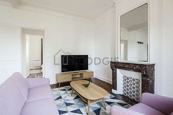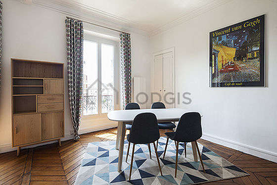 SéjourCet appartement est composé d'un beau salon avec du parquet au sol et des fenêtres double vitrage. Ce salon calme est meublé et équipé pour rendre votre séjour agréable : télé, canapé, 1 fauteuil(s), table à manger, table basse, bibliothèque, etagère, buffet, placard, cheminée, 1 chaise(s), tabouret, lampadaire sur pied, meuble tv, miroir, porte manteaux, pouf, tableau, tapis.