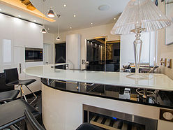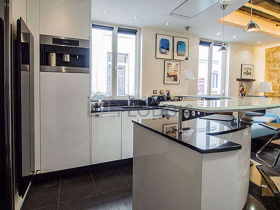 Cet appartement dispose d'une magnifique cuisine avec du carrelage au sol et tout l'équipement essentiel pour votre quotidien : plaques de cuisson, réfrigerateur, congélateur, four, micro ondes, hotte, grille pain, bouilloire électrique, cafetière, placard, vaisselle, tabouret, bar, spot.