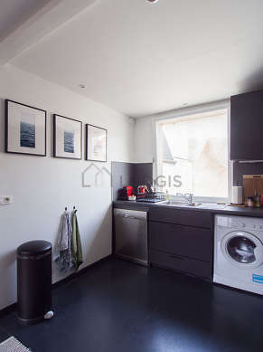 Cet appartement dispose d'une magnifique cuisine avec du béton au sol et tout l'équipement indispensable pour votre quotidien : plaques de cuisson, réfrigerateur, congélateur, four, hotte, grille pain, bouilloire électrique, cafetière, table à manger, placard, vaisselle, 1 chaise(s).