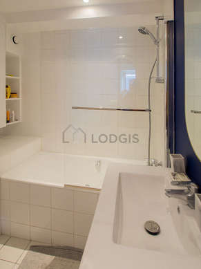 Cet appartement est équipé d'une salle de bain magnifique et claire. Cette salle d'eau bénéficie du nécessaire pour votre bien-être au quotidien : serviettes de bain, etagère, placard, baignoire, lavabo, radiateur sèche-serviettes. Les toilettes sont intégrées dans la salle de bain.