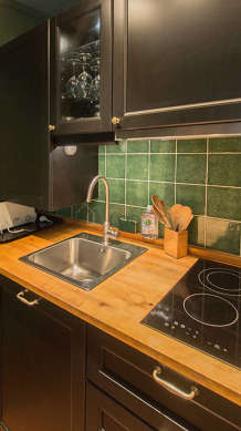 Cet appartement dispose d'une magnifique cuisine avec de la tomettes au sol et tout l'équipement indispensable pour votre quotidien : plaques de cuisson, réfrigerateur, congélateur, micro ondes, micro onde combiné, freezer, hotte, grille pain, bouilloire électrique, cafetière, etagère, placard, vaisselle.