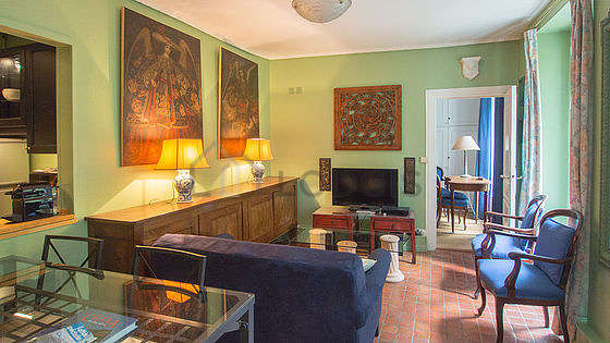 SéjourCet appartement est composé d'un superbe salon avec de la tomettes au sol et des fenêtres et vue sur jardin. Ce salon très calme est meublé et équipé pour rendre votre séjour agréable : télé, canapé, 2 fauteuil(s), table à manger, table basse, commode, buffet, 4 chaise(s), meuble tv, tableau.