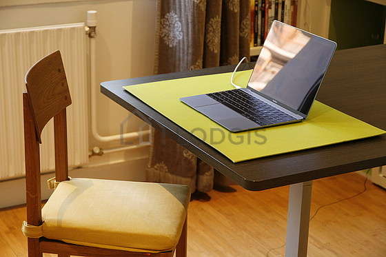 Cet appartement dispose d'une cuisine avec du parquet au sol et tout l'équipement indispensable pour votre quotidien : plaques de cuisson, réfrigerateur, congélateur, four, hotte, bouilloire électrique, cafetière, placard, vaisselle.