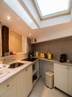Cet appartement dispose d'une belle cuisine avec du carrelage au sol et tout l'équipement essentiel pour votre quotidien : plaques de cuisson, réfrigerateur, congélateur, four, micro ondes, grille pain, bouilloire électrique, etagère, placard, vaisselle, bar.