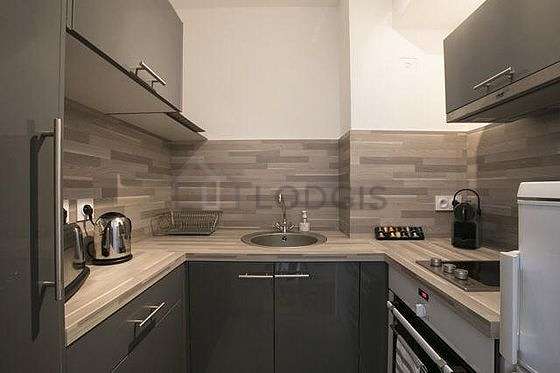 Cet appartement dispose d'une magnifique cuisine avec du carrelage au sol et tout l'équipement nécessaire pour votre quotidien : télé, plaques de cuisson, réfrigerateur, congélateur, micro ondes, micro onde combiné, hotte, grille pain, cafetière, table à manger, bureau, penderie, etagère, armoire, commode, placard, vaisselle, 1 chaise(s), console, etendoir, lampadaire sur pied, meuble tv, miroir, poubelle, tableau, tapis.