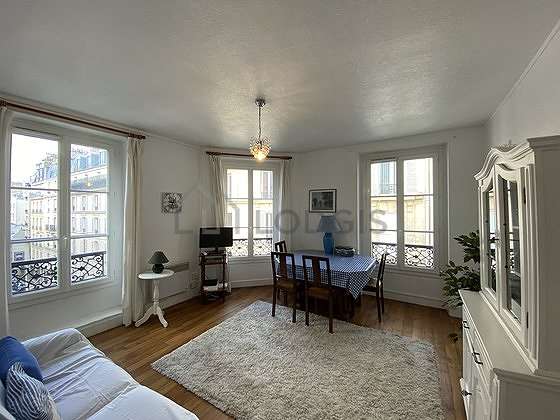 SéjourCet appartement est composé d'un beau salon avec du parquet au sol et des fenêtres. Ce salon très calme est meublé et équipé pour rendre votre séjour agréable : télé, canapé, table à manger, buffet, placard, 1 chaise(s).