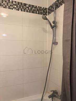 Cet appartement est équipé d'une salle de bain magnifique et très claire. Cette salle d'eau bénéficie du nécessaire pour votre bien-être au quotidien : serviettes de bain, etagère, armoire, placard, baignoire, sèche cheveux, etendoir, lavabo, miroir, porte serviettes, poubelle, ventilateur. Les toilettes sont intégrées dans la salle de bain.