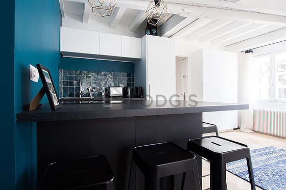 Cet appartement dispose d'une magnifique cuisine avec du parquet au sol et tout l'équipement nécessaire pour votre quotidien : plaques de cuisson, réfrigerateur, four, grille pain, bouilloire électrique, cafetière, etagère, placard, vaisselle, tabouret, bar.