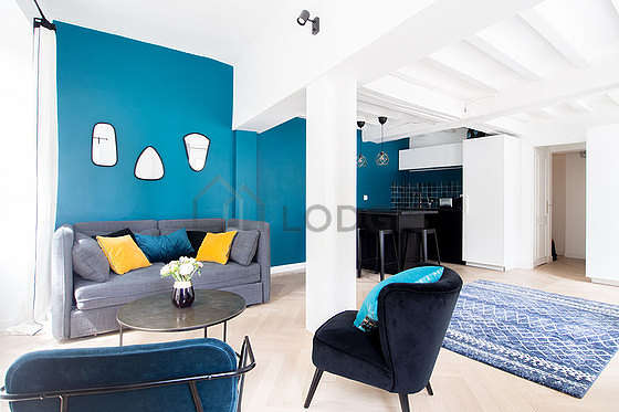SéjourCet appartement est composé d'un magnifique salon avec du parquet au sol et des fenêtres et vue sur rue. Ce salon très calme est meublé et équipé pour rendre votre séjour agréable : télé, 2 fauteuil(s), table basse, meuble tv, tapis1 canapé(s) lit(s) de 160cm.