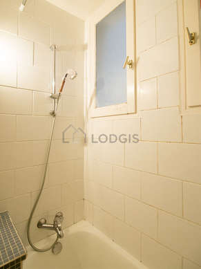 Cet appartement est équipé d'une salle de bain magnifique avec des fenêtres. Cette salle d'eau bénéficie du nécessaire pour votre bien-être au quotidien : etagère, baignoire, lavabo, miroir. Les toilettes sont séparées de la salle de bain et situées dans une pièce indépendante.