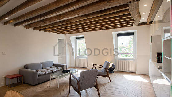 Cet appartement est composé d'un superbe salon avec du parquet au sol vue sur rue. Ce salon calme est meublé et équipé pour rendre votre séjour agréable : télé, canapé, 1 fauteuil(s), table basse, etagère, placard, poutre.