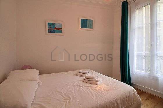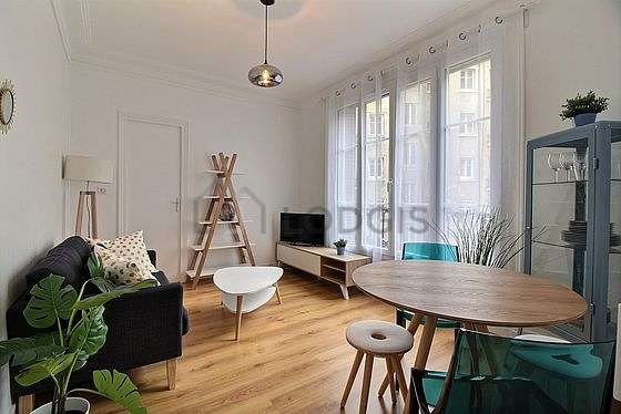 SéjourCet appartement est composé d'un séduisant salon avec du parquet au sol et des fenêtres. Ce salon très calme est meublé et équipé pour rendre votre séjour agréable : télé, canapé, table à manger, etagère, armoire, placard, 1 chaise(s).
