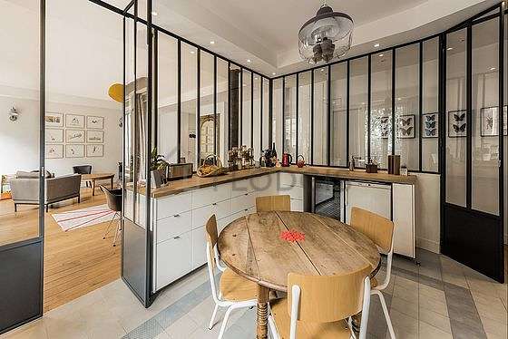 SéjourCe duplex est composé d'un magnifique salon avec du parquet au sol vue sur rue. Ce salon calme est meublé et équipé pour rendre votre séjour agréable : canapé, 1 fauteuil(s), table à manger, etagère, 1 chaise(s), miroir, tapis.
