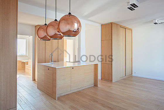 Cet appartement dispose d'une magnifique cuisine avec du parquet au sol et tout l'équipement indispensable pour votre quotidien : plaques de cuisson, réfrigerateur, congélateur, four, bouilloire électrique, cafetière, vaisselle.